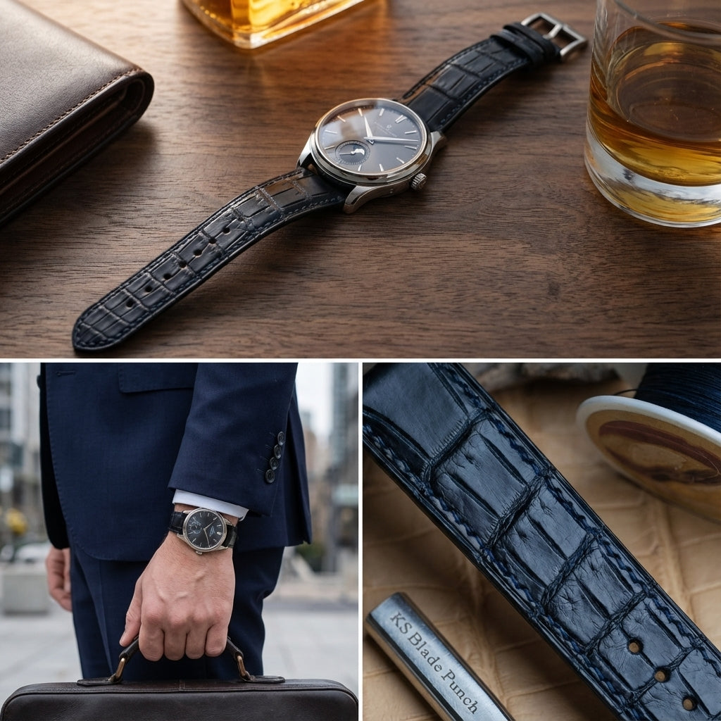Witness the transformation: genuine alligator hide meticulously handcrafted into premium watch straps — nature's texture meets artisan precision.